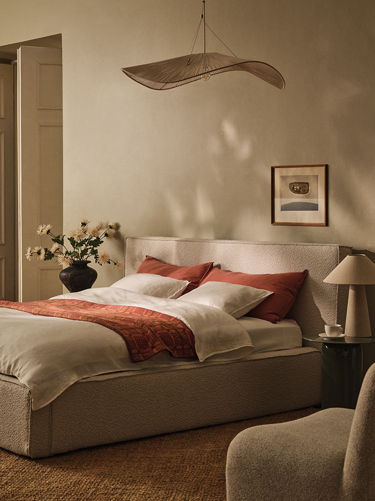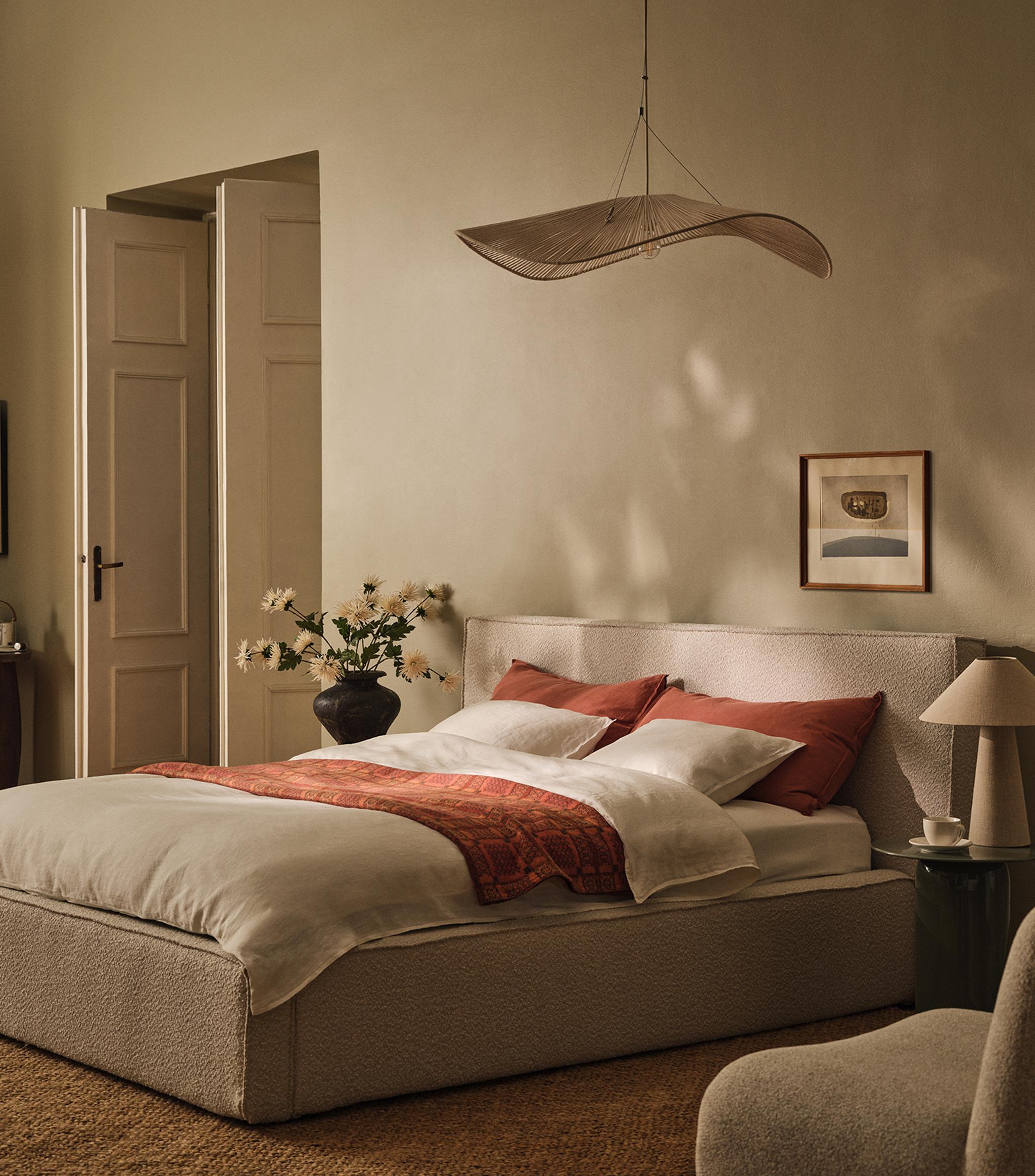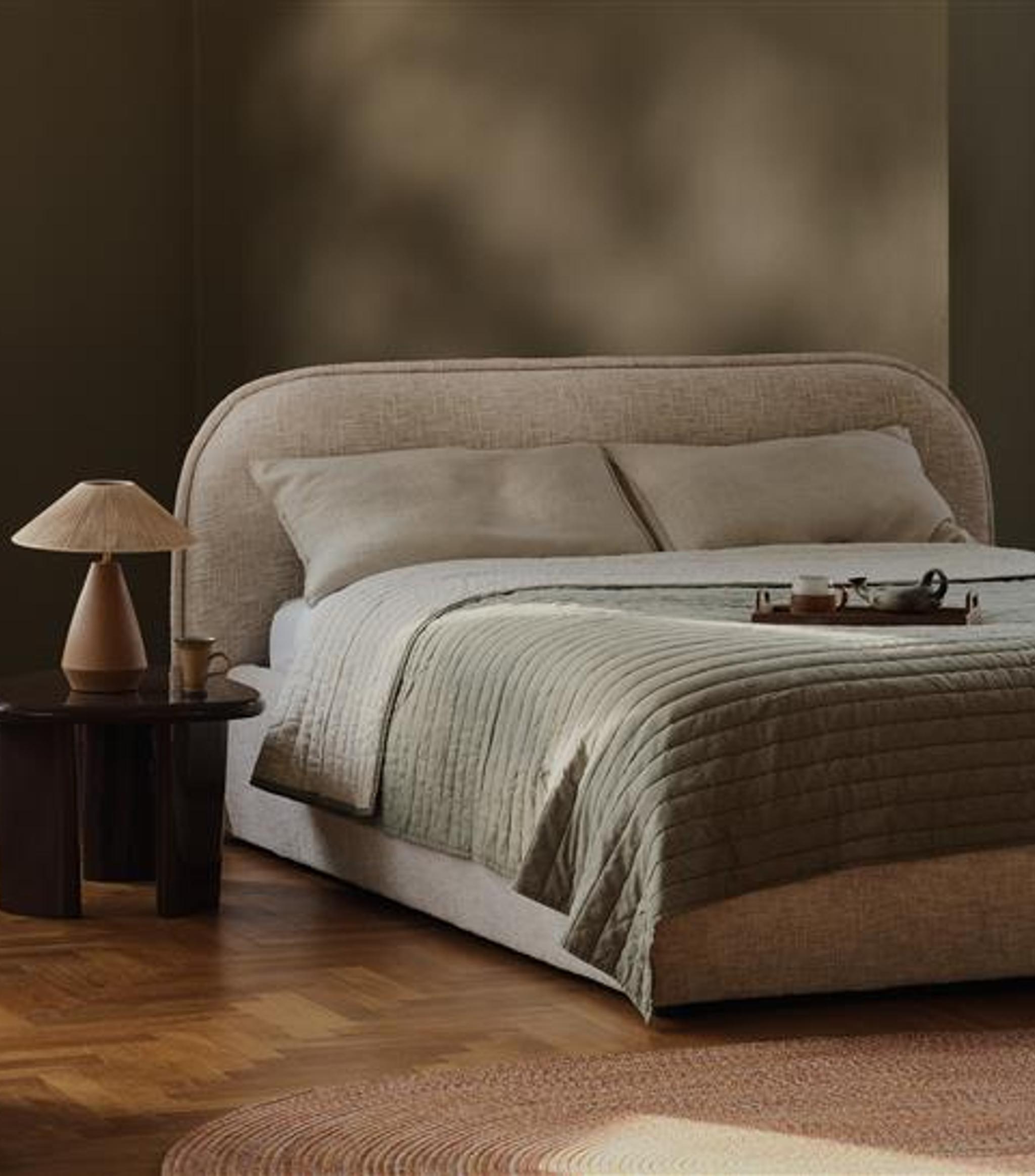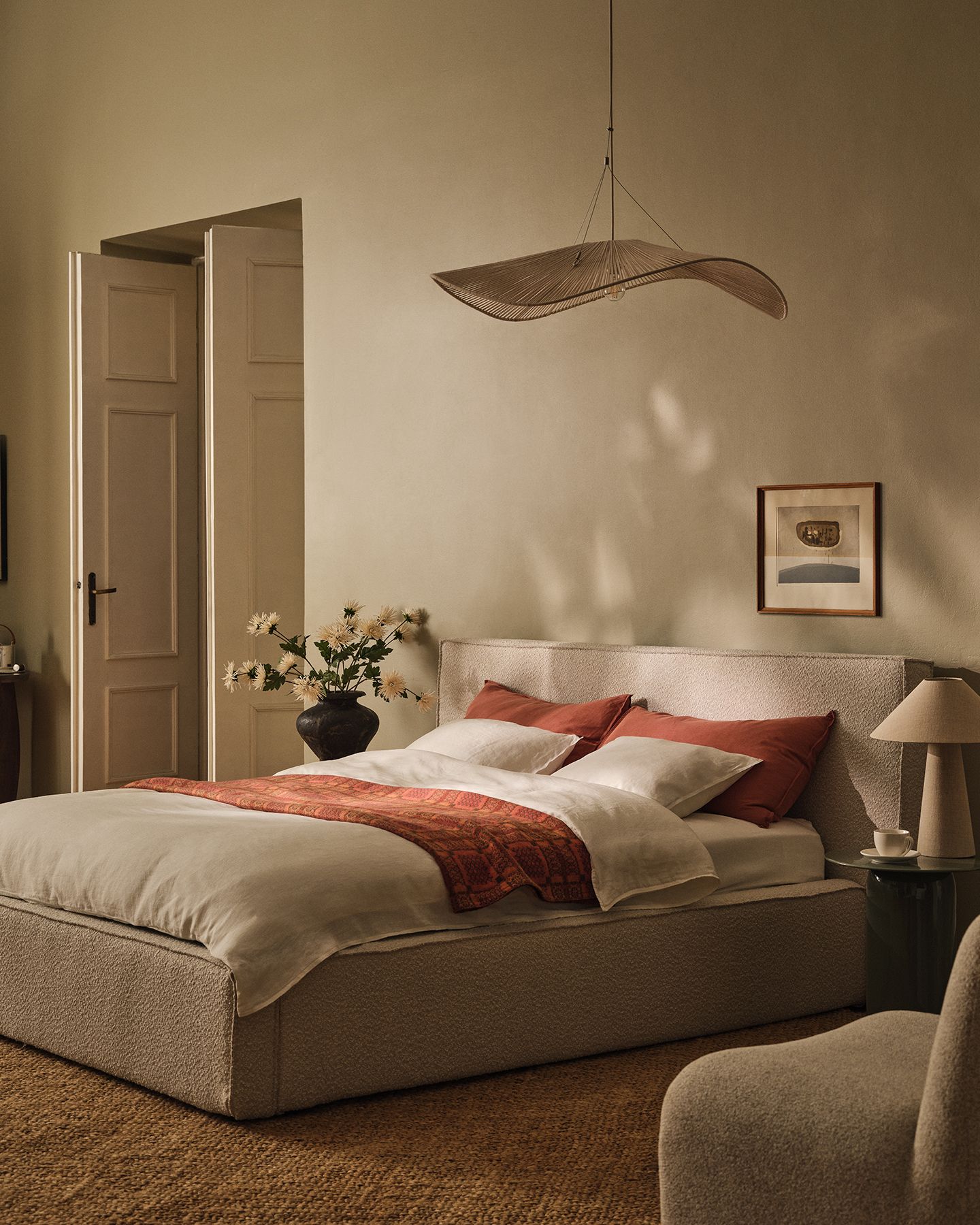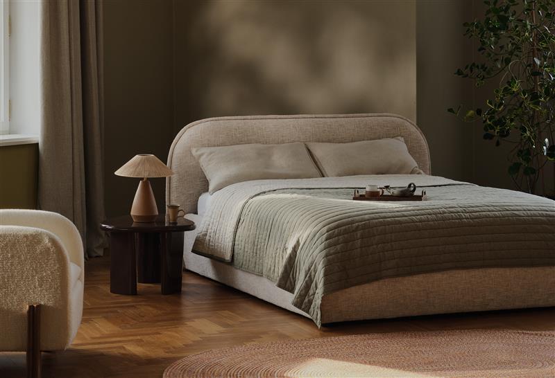 Lit en tissu structuré, bouclé, velours ou chenille, avec tête de lit et boîte à draps