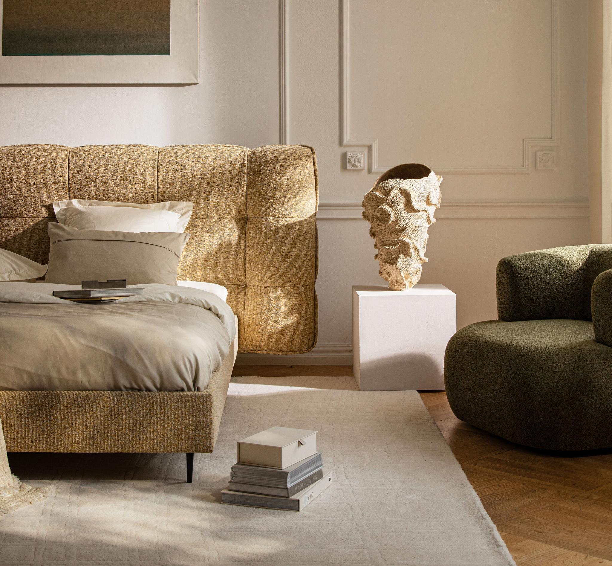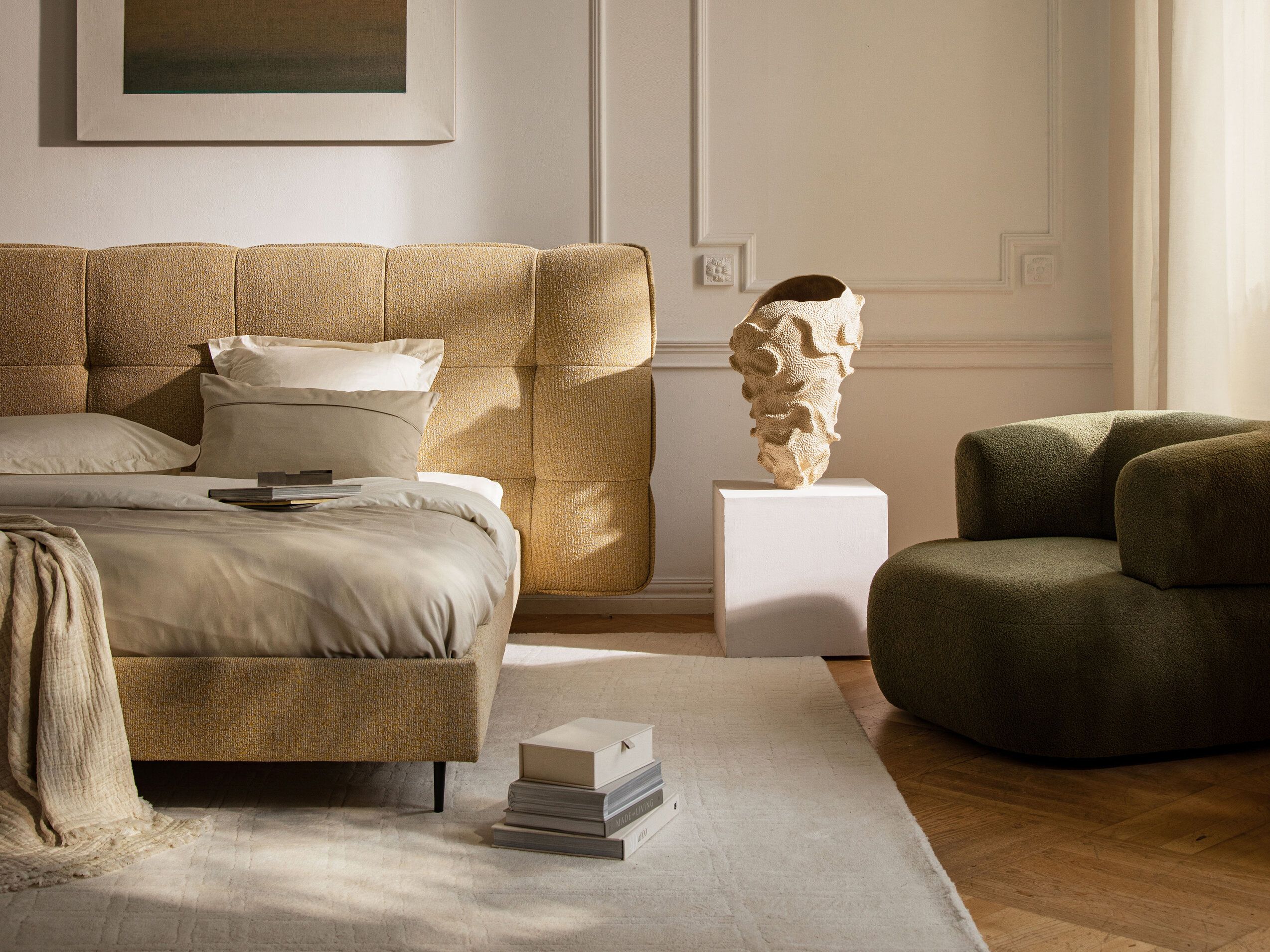 La silhouette élancée du lit présente des proportions novatrices. Il repose sur une base minimaliste et une tête de lit profilée avec des « ailes », légèrement plus large que le cadre.