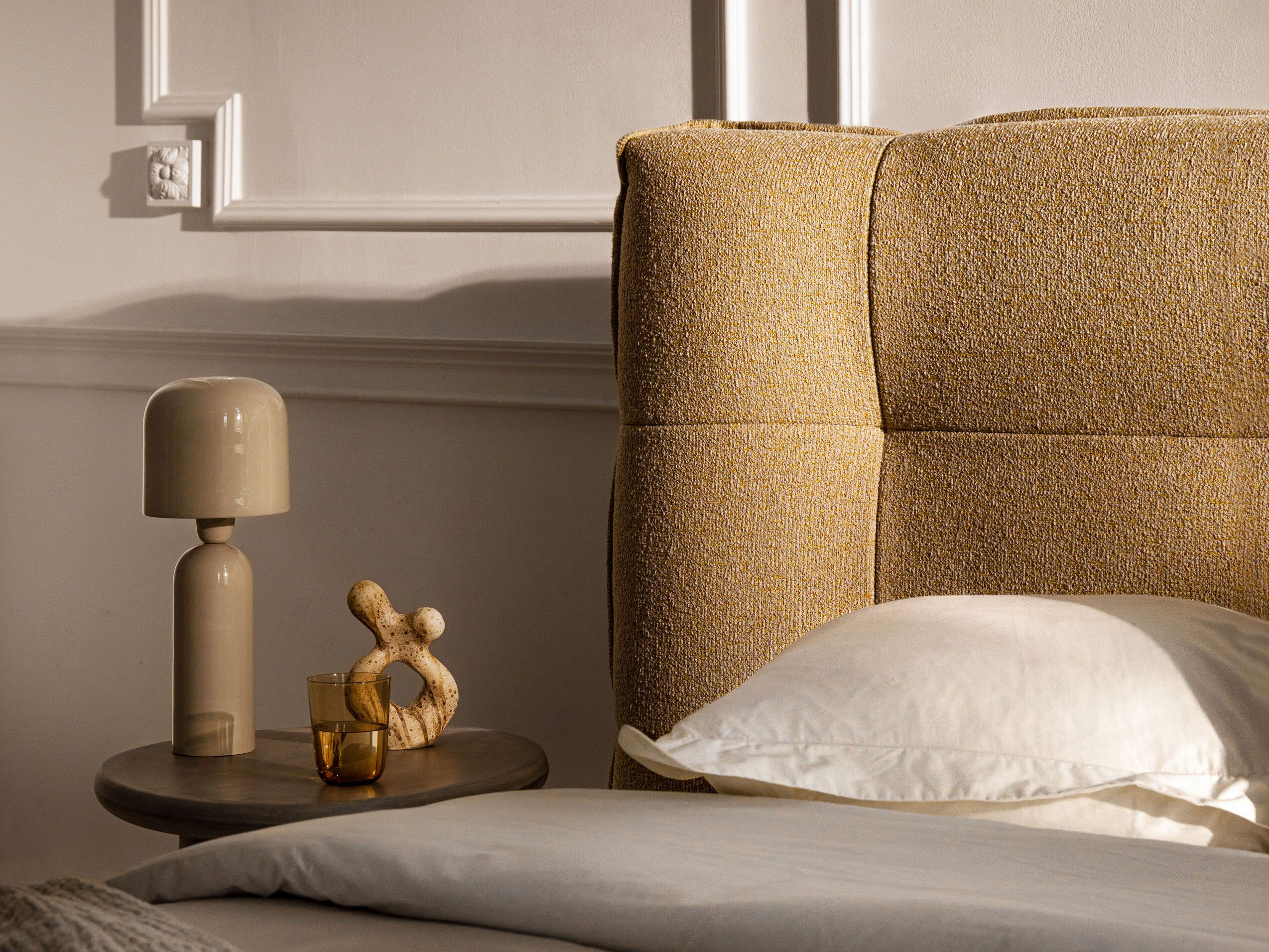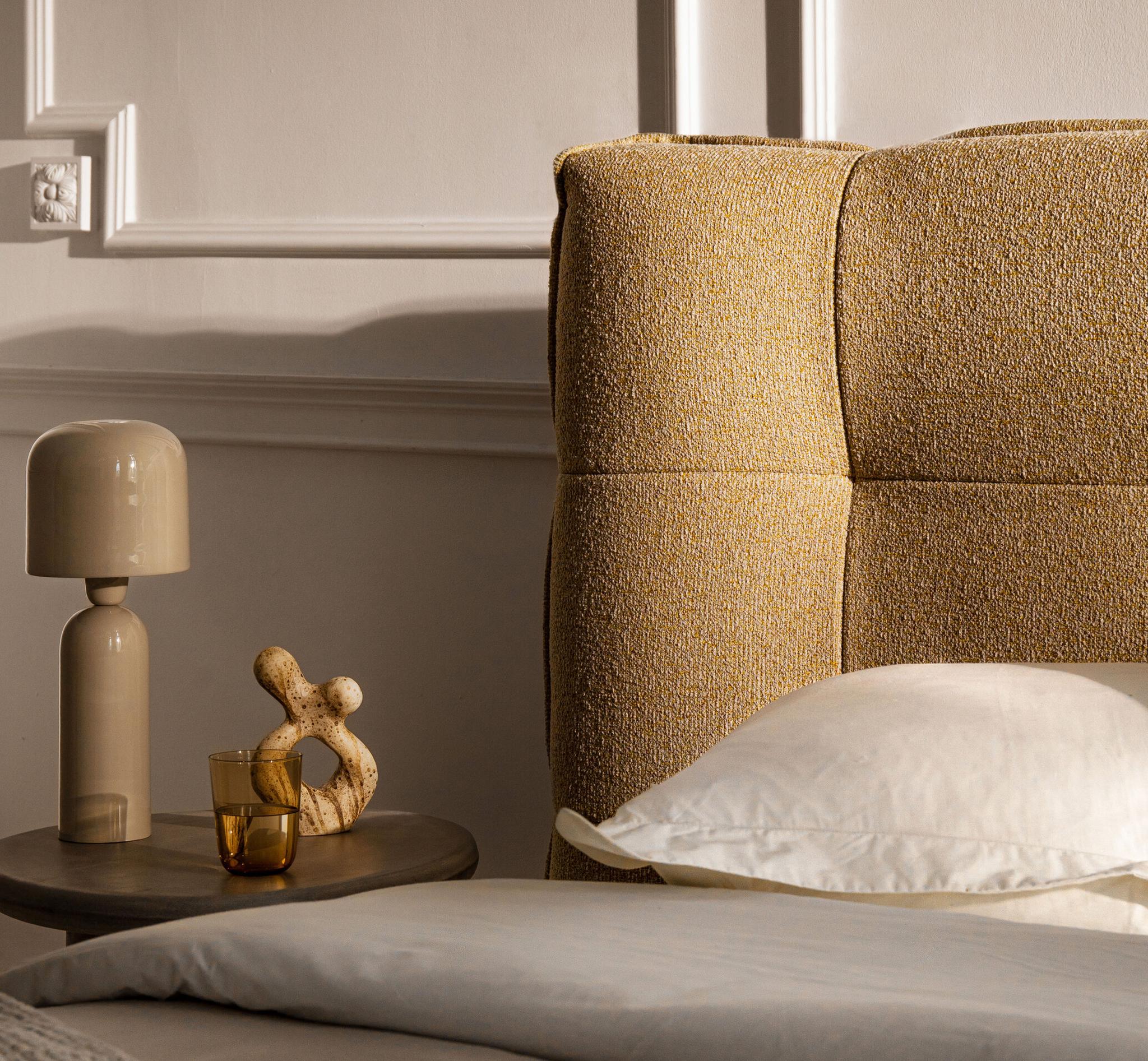 La tête de lit moelleuse n'est pas seulement un dossier confortable. Le motif géométrique des coutures, le capitonnage et le passepoil lui confèrent un caractère décoratif.