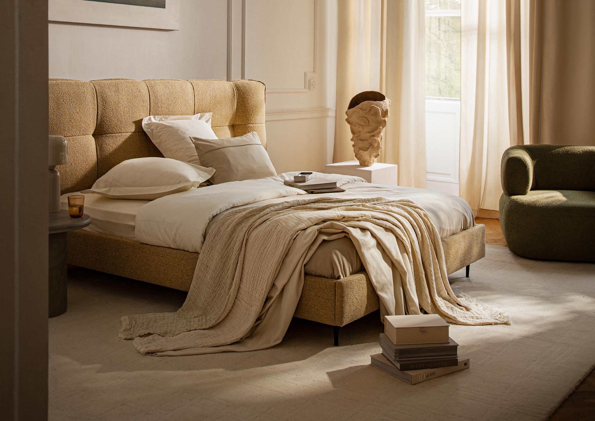 Lit en tissu structuré, bouclé, velours ou chenille, avec tête de lit et boîte à draps