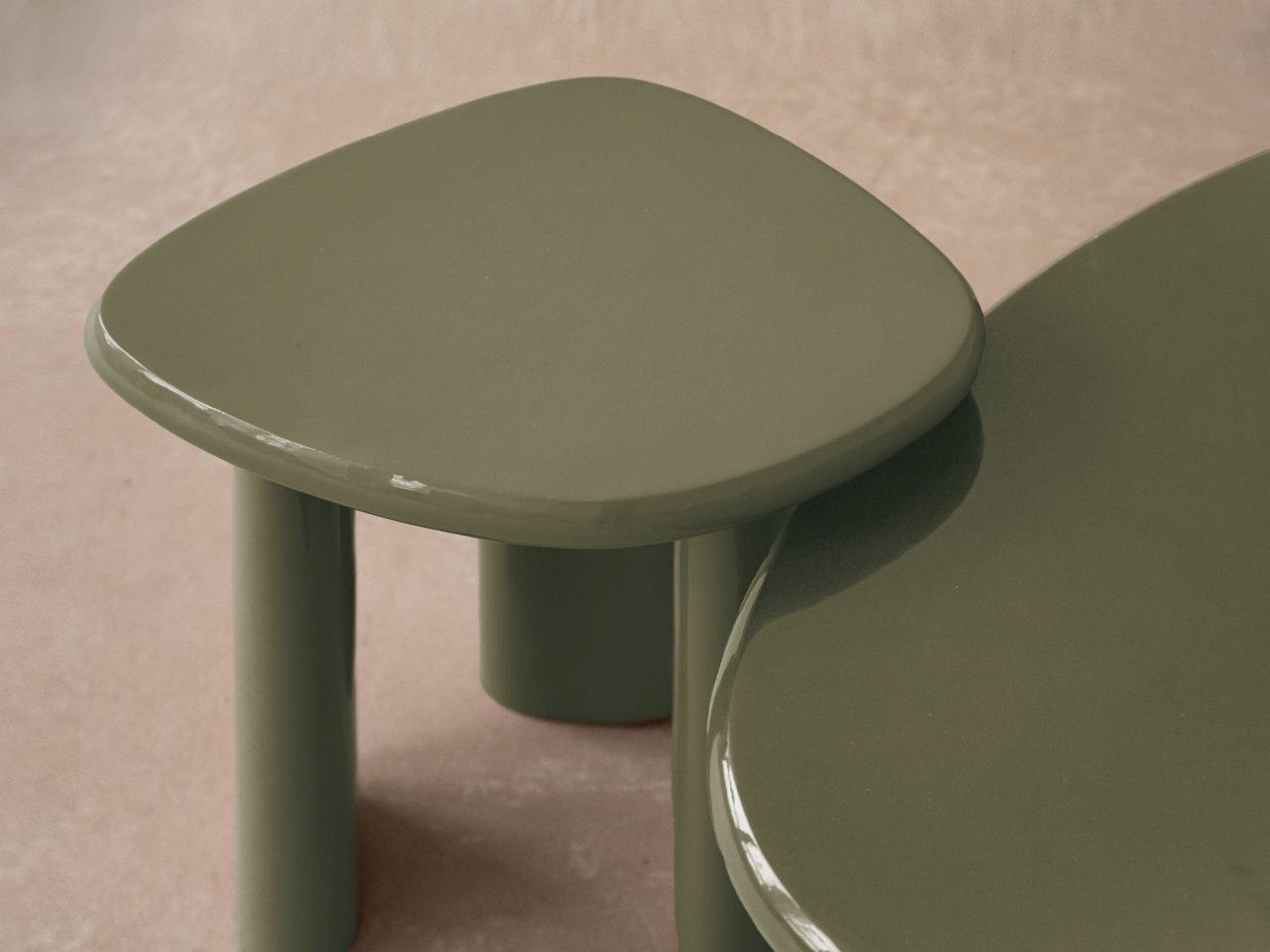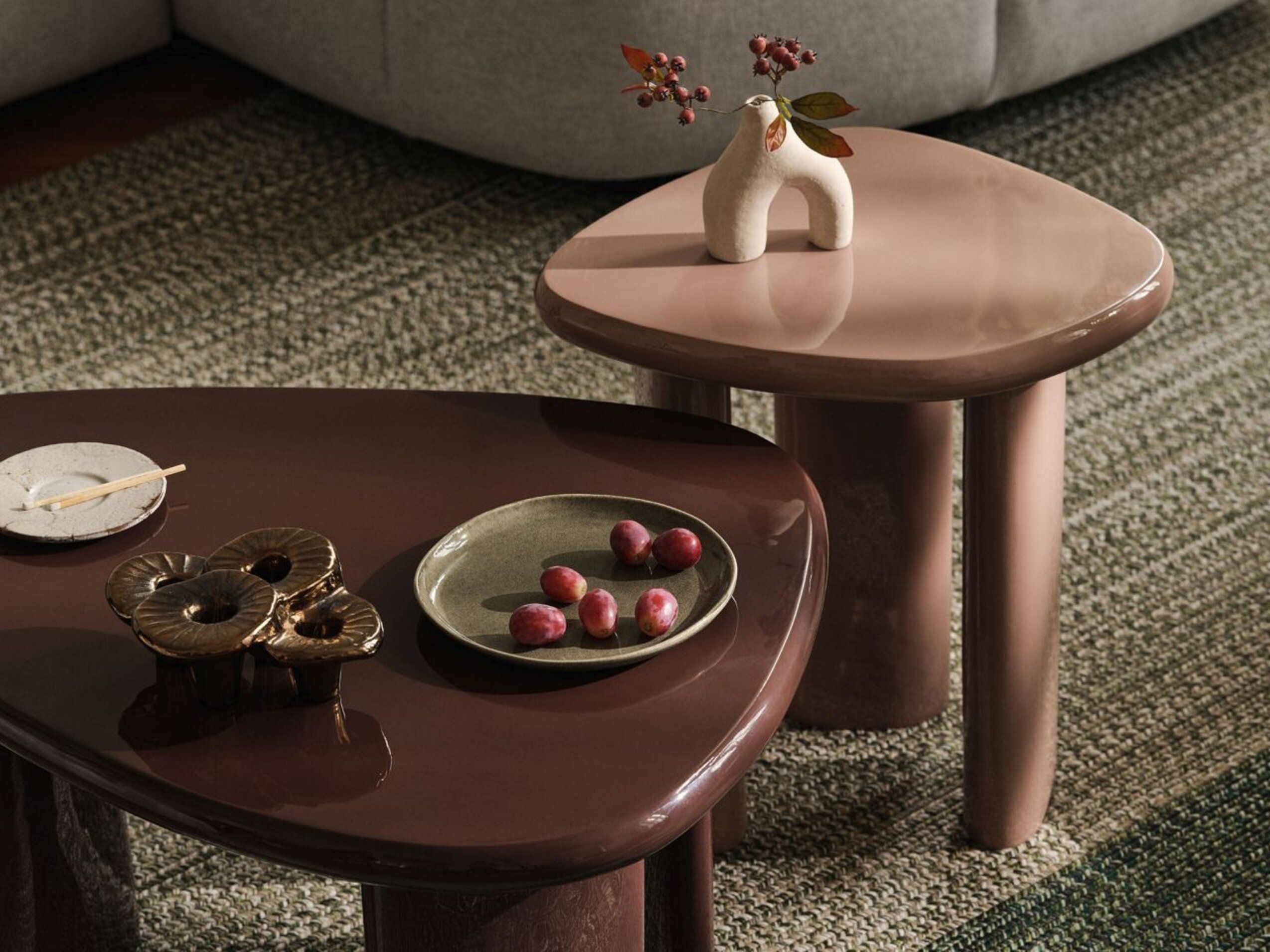 Les tables Lawrence ? la forme organique et aux bords arrondis séduisent par leur laque brillante et leurs couleurs audacieuses.