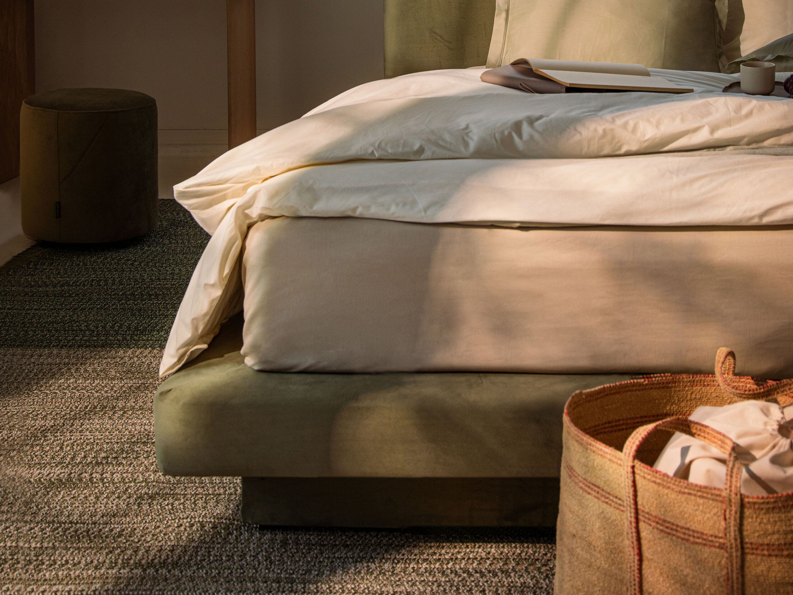 Le matelas repose directement sur une plateforme tapissée et une base supplémentaire qui remplace les pieds. La double base assure une surface stable et plane.
