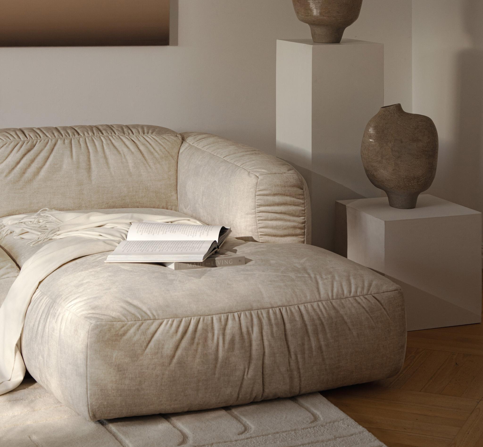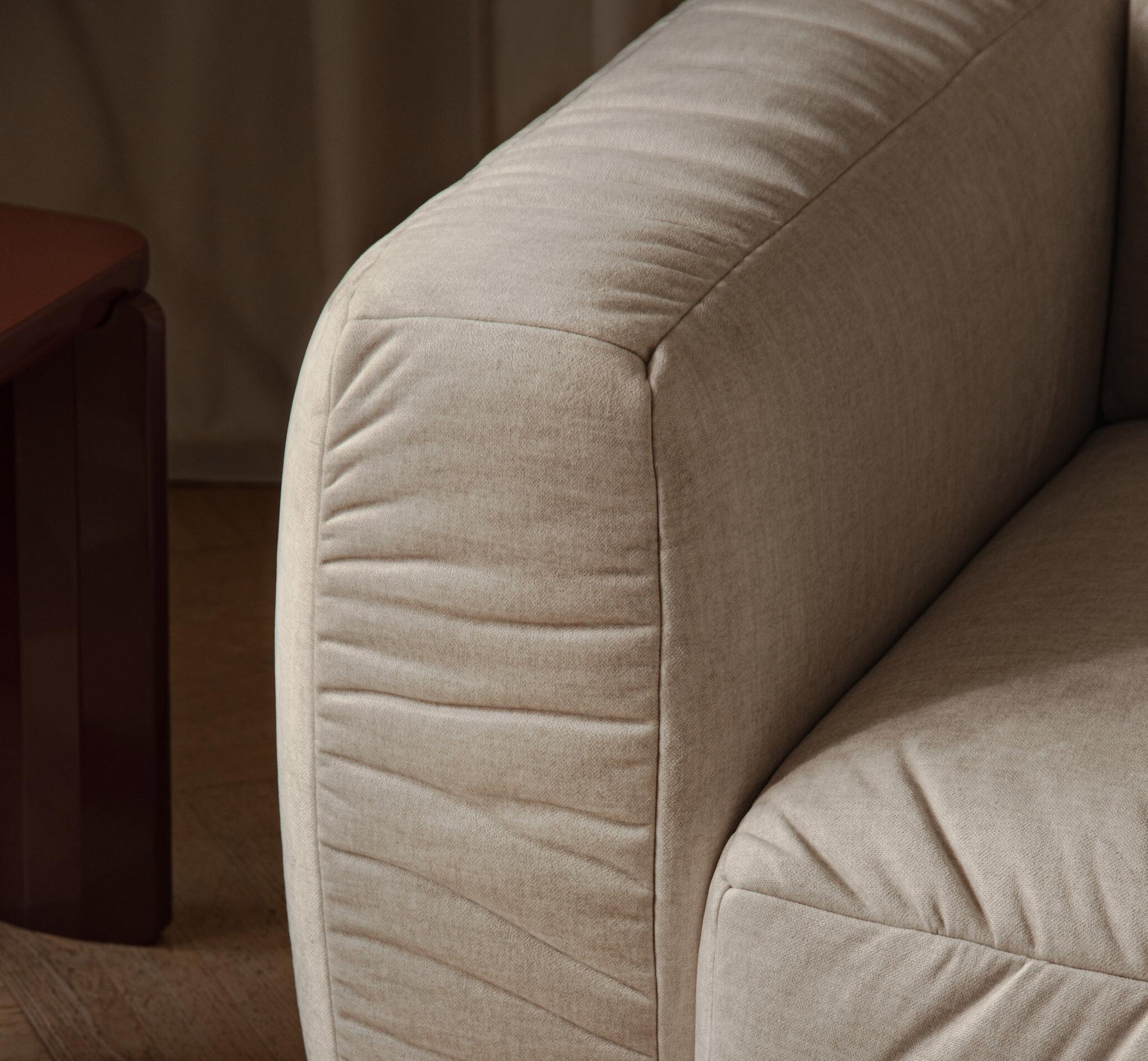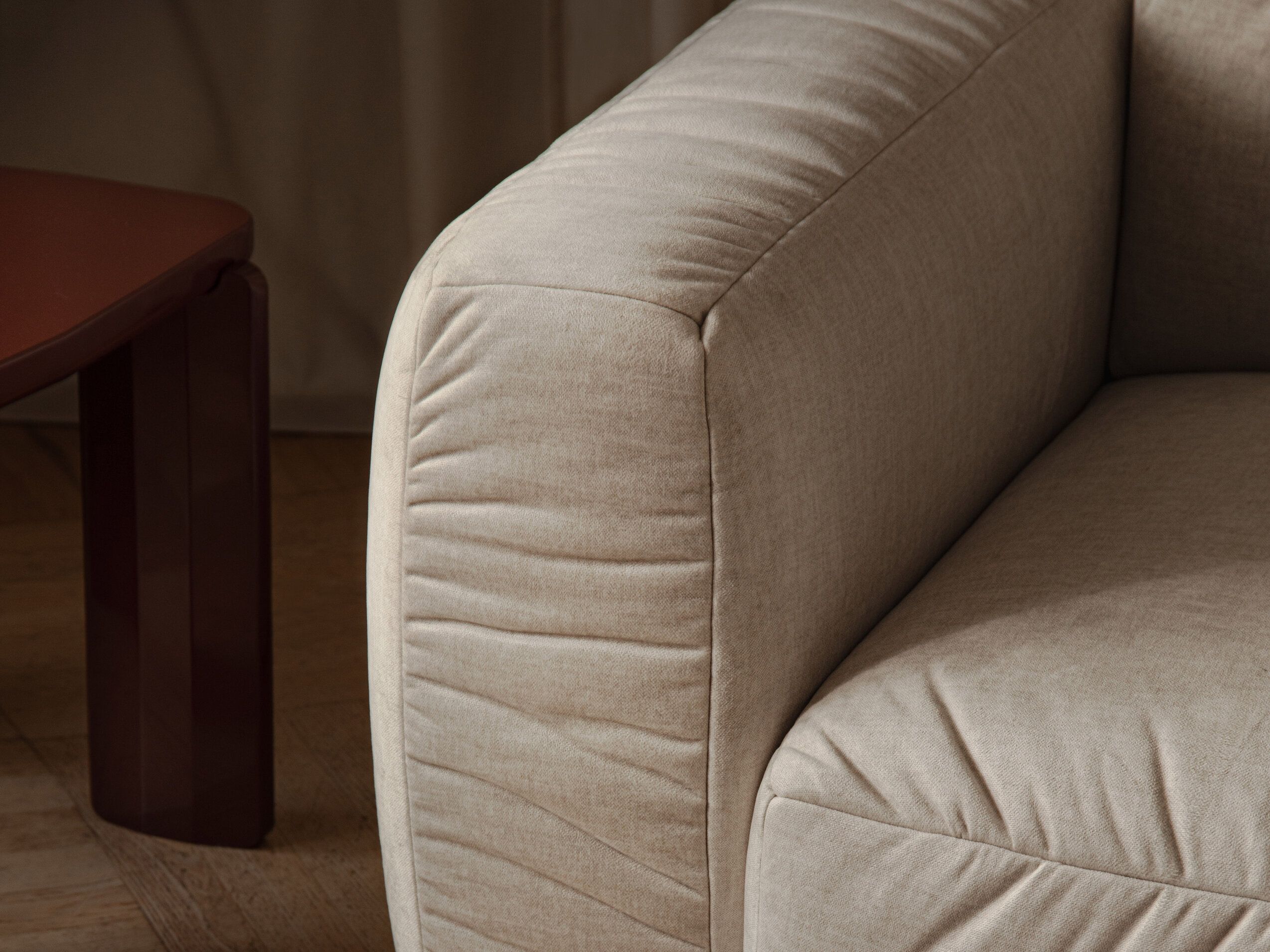 Les fronces décoratives et les formes arrondies donnent au canapé un style caractéristique. La partie extensible de l'assise est parfaitement ajustée à l'accoudoir.