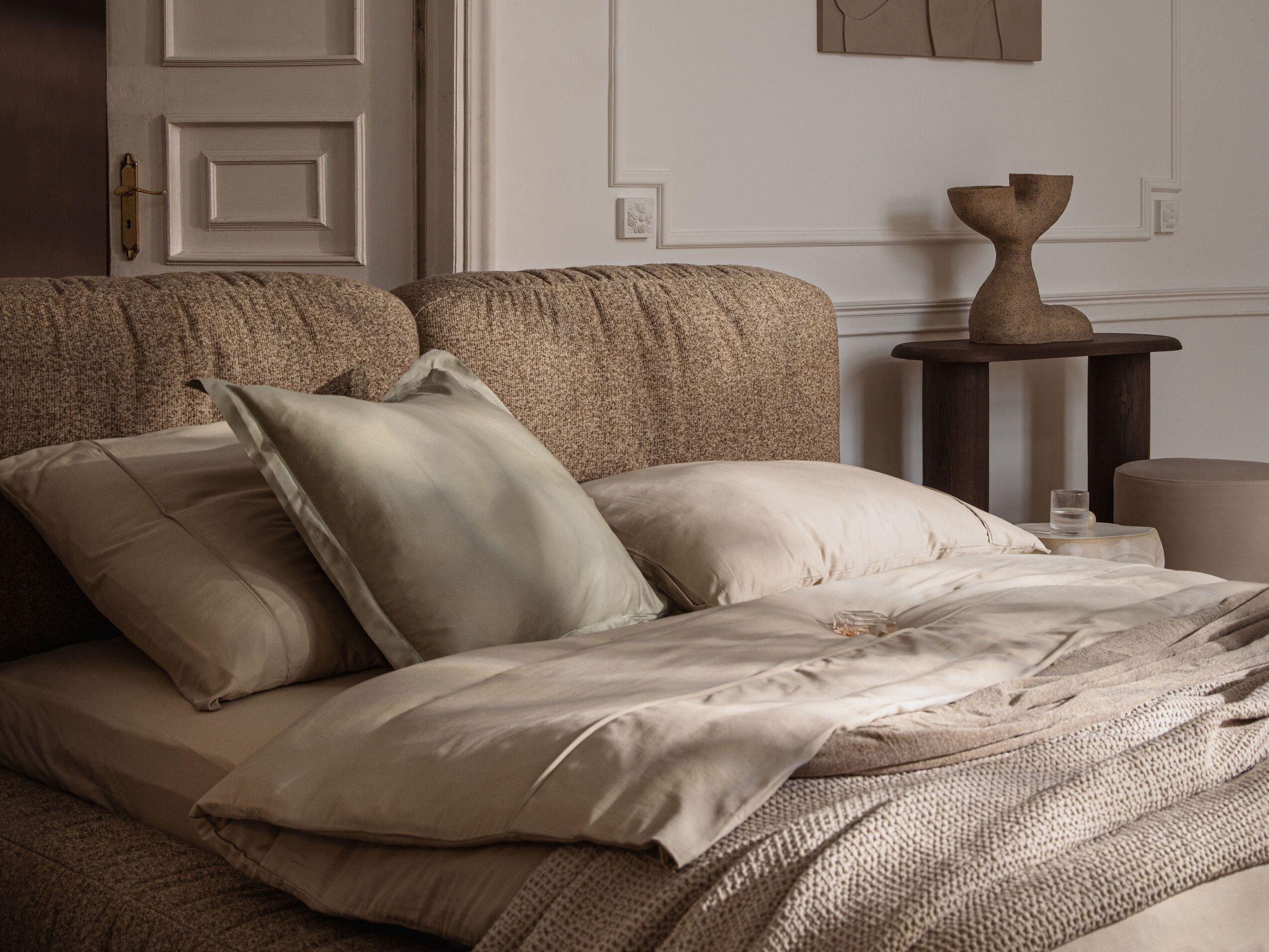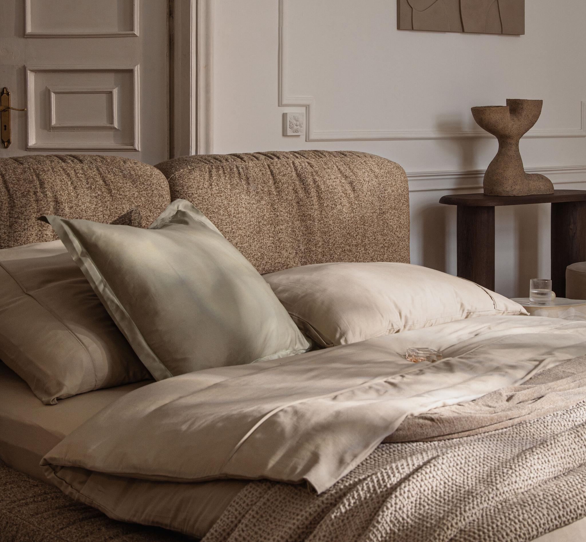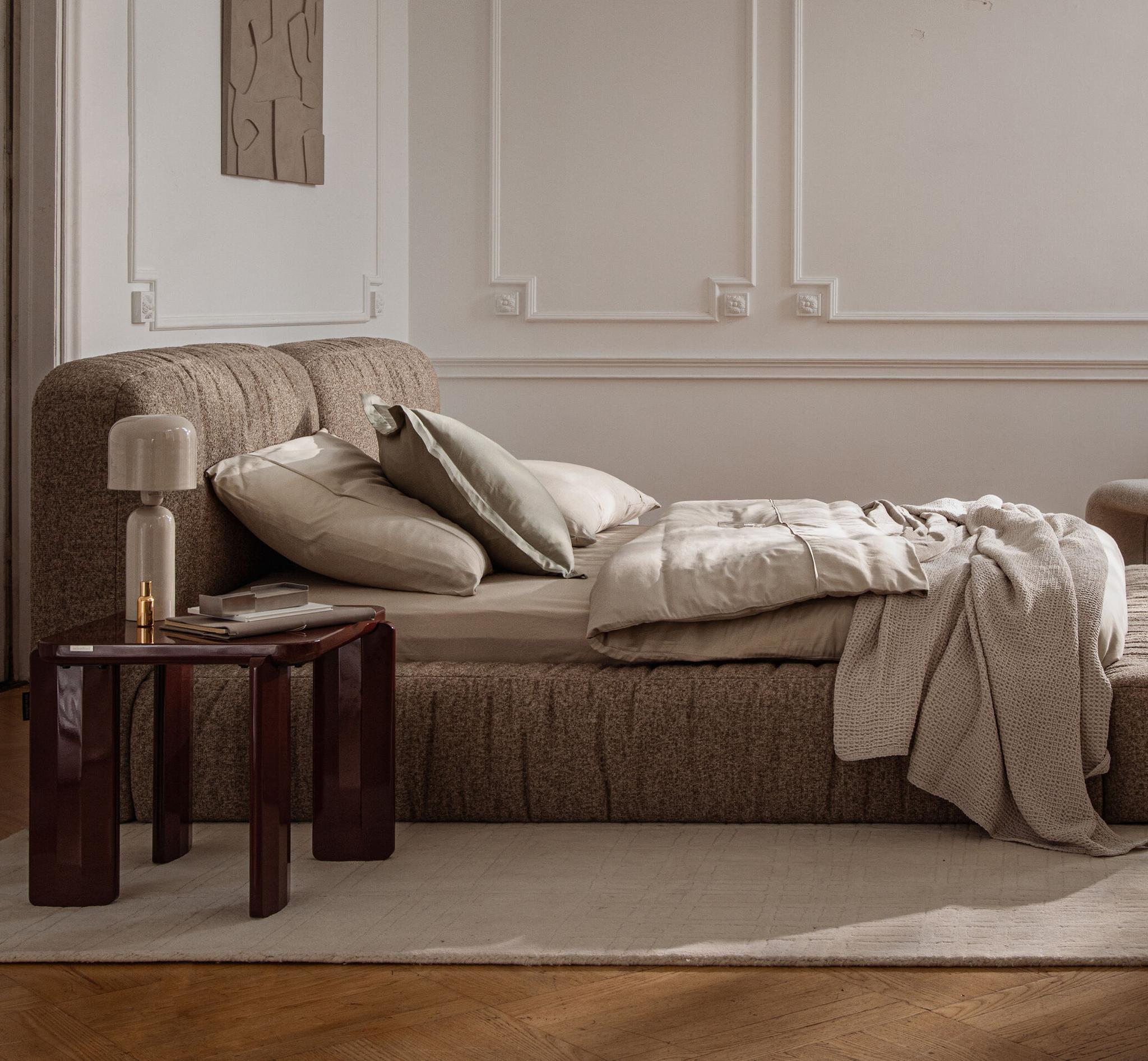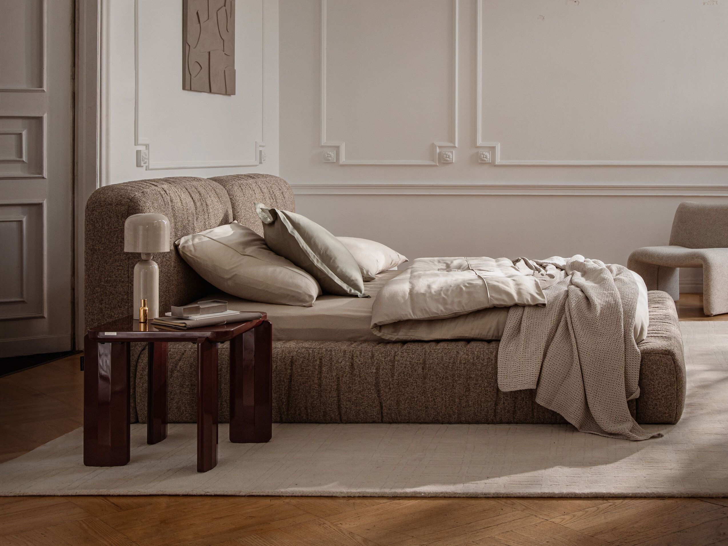 Un large cadre entoure le matelas et donne au lit un profil reconnaissable. Le coffre dissimulé permet de ranger la literie et les textiles, aidant à maintenir l'ordre.