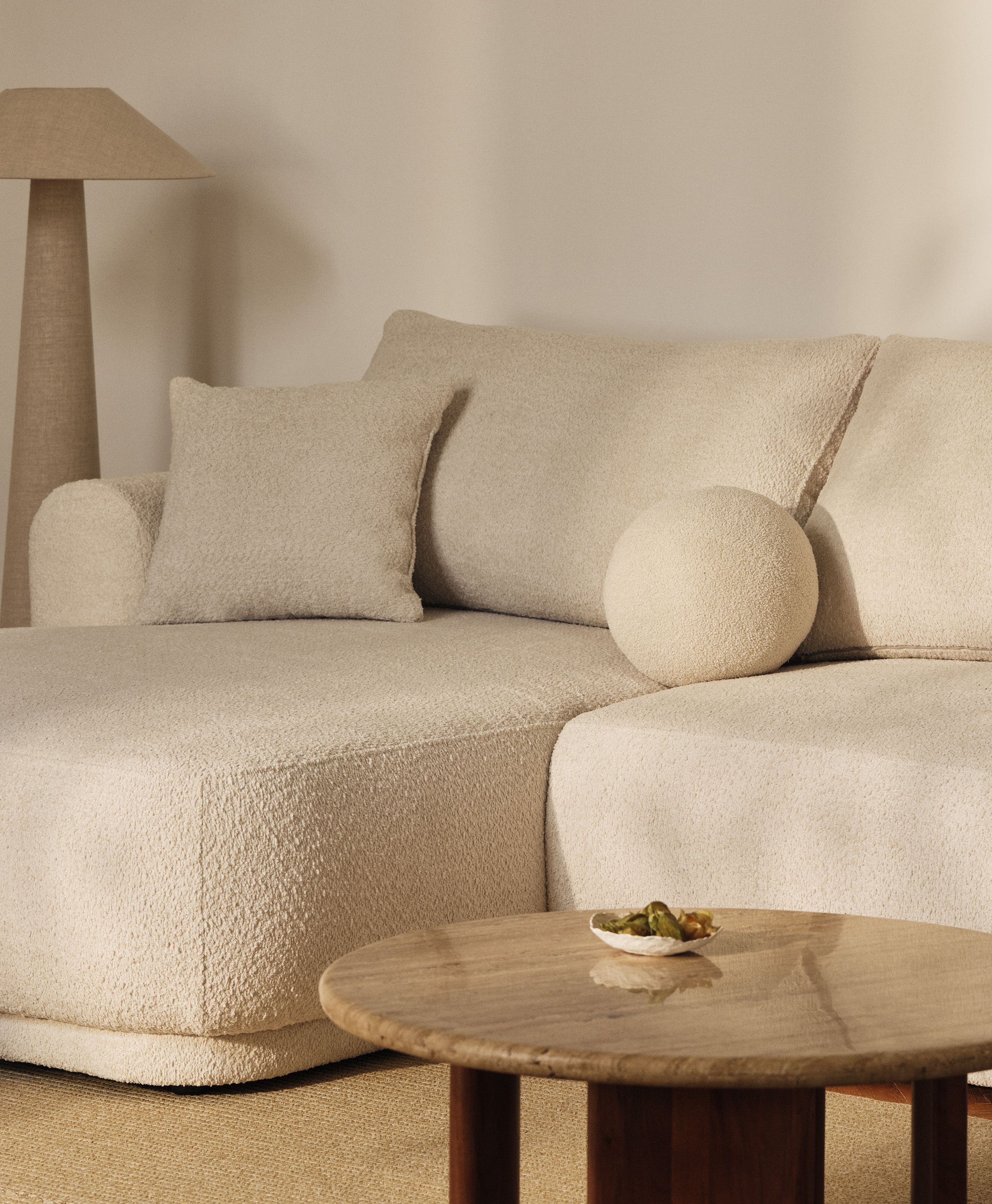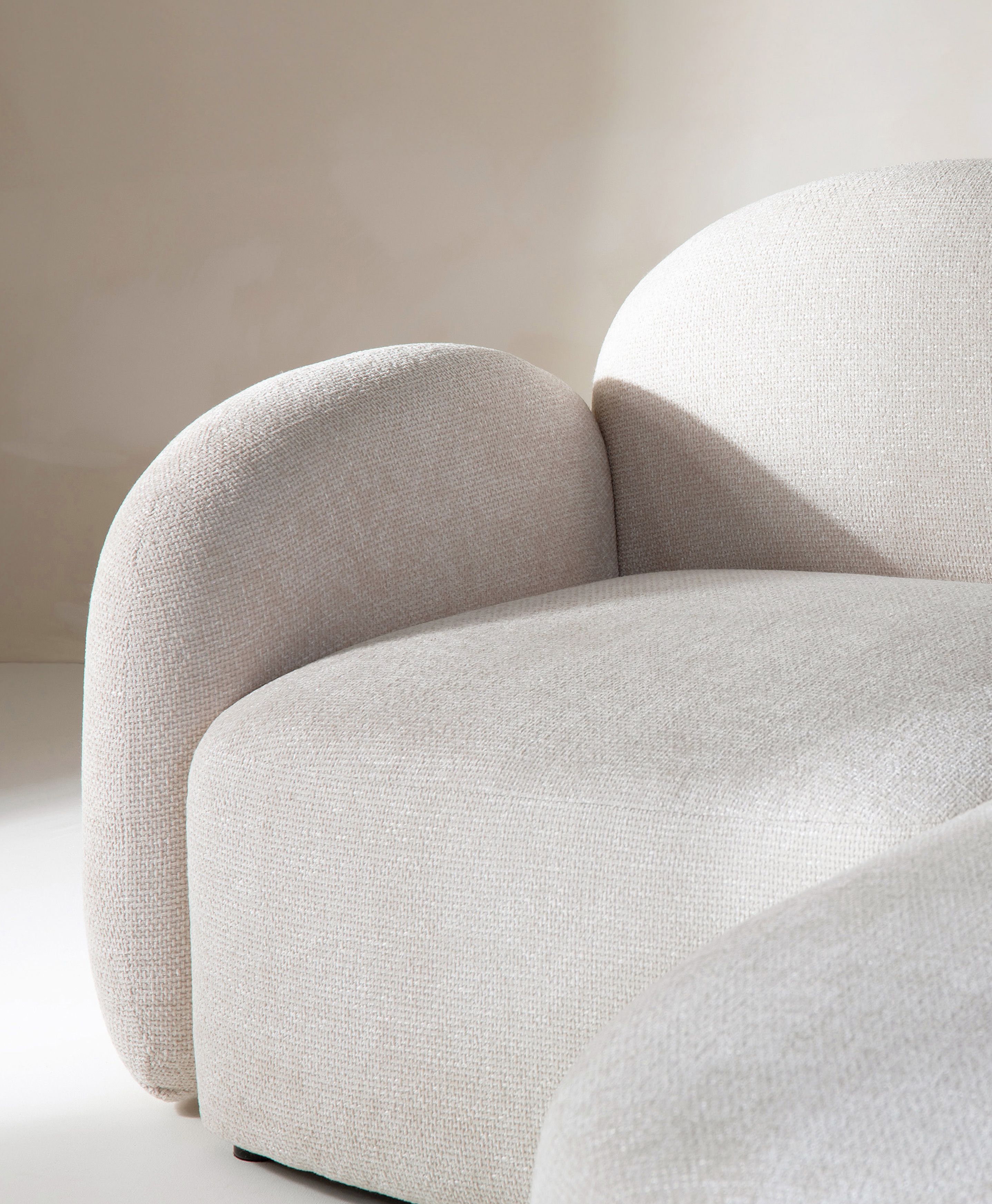 Canapé modulaire Bellis en bouclé beige texturé avec assises matelassées profondes et forme sculpturale – mobilier de salon Micadoni
