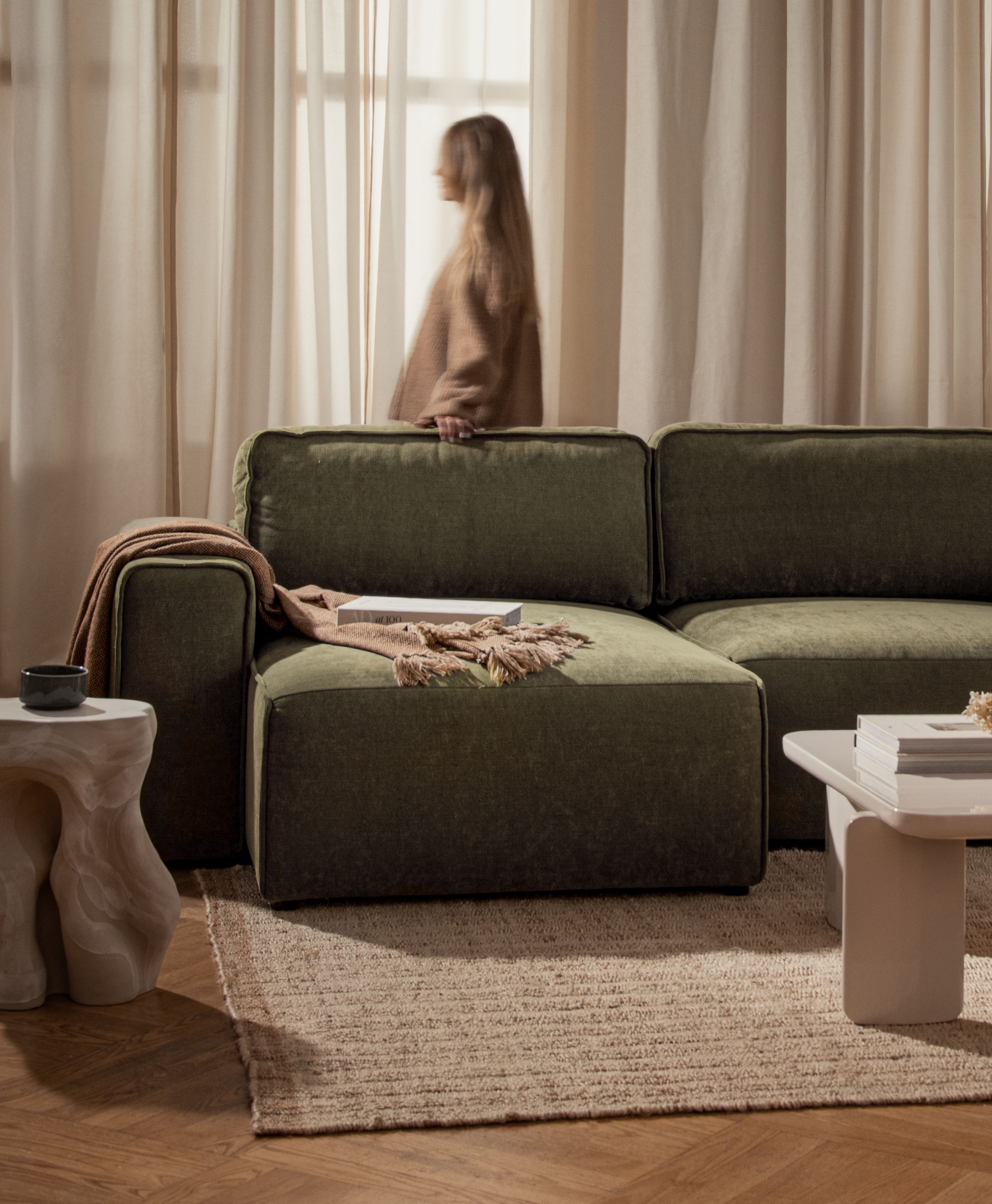 Canapé modulaire Bloom en velours vert olive avec grands coussins de dossier et silhouette décontractée – mobilier de salon Micadoni